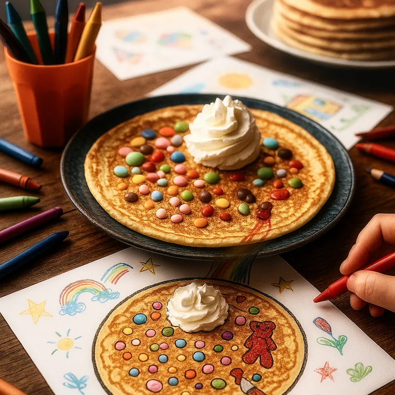 Meest gekozen door kinderen, ‘Teken je eigen pannenkoek’. Kinderen tekenen hun eigen droompannenkoek en onze pannenkoekenbakker maakt hem in het echt!